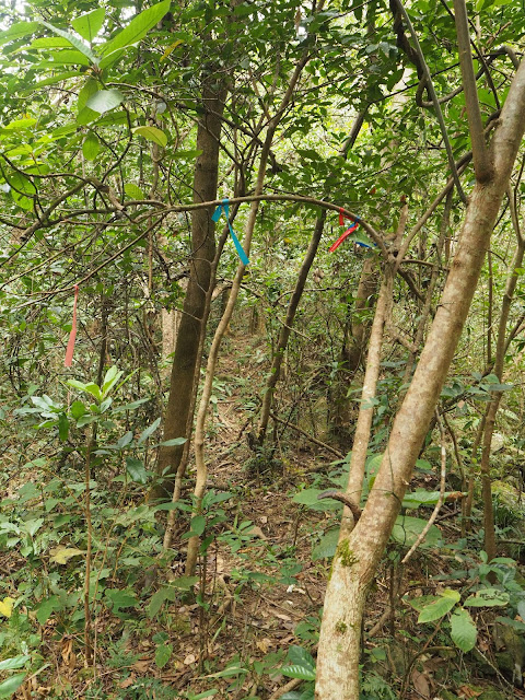 在小坳位東望地點 H4 而來的脊路。現已沒路,脊甚陡,且上段被樹藤封路,要開路前進。